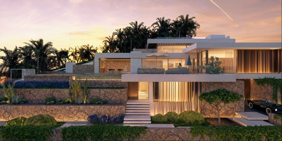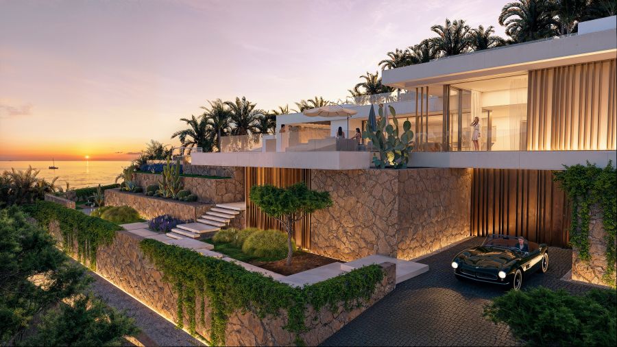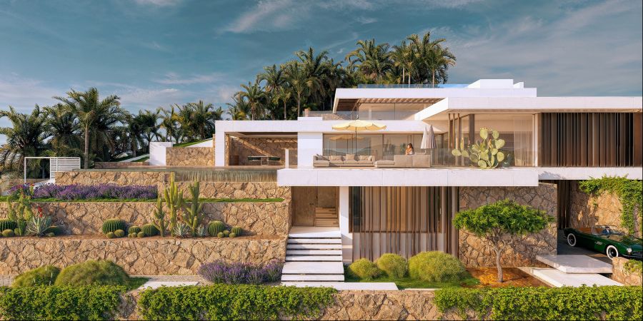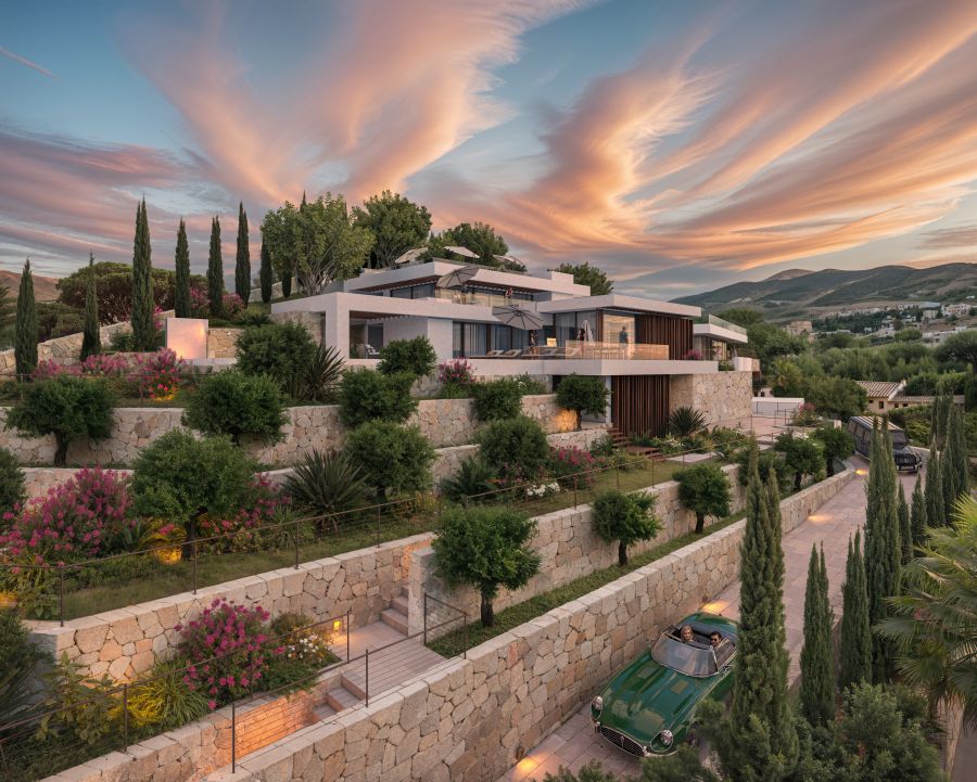 Contemporary home composed of exposed concrete cantilevers and traditional stone walls, designed to adapt to the site's steep slope.