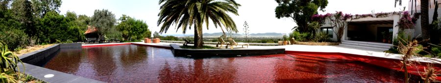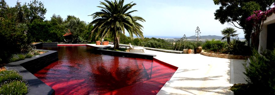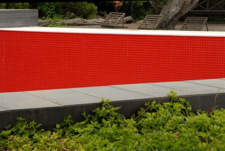 Renovation of an old pool with kidney's shape. The project changed completely the aesthetic, giving a new image of red pond. The polygonal walls of black slate embrace the deeper parts and spreads into the nature.